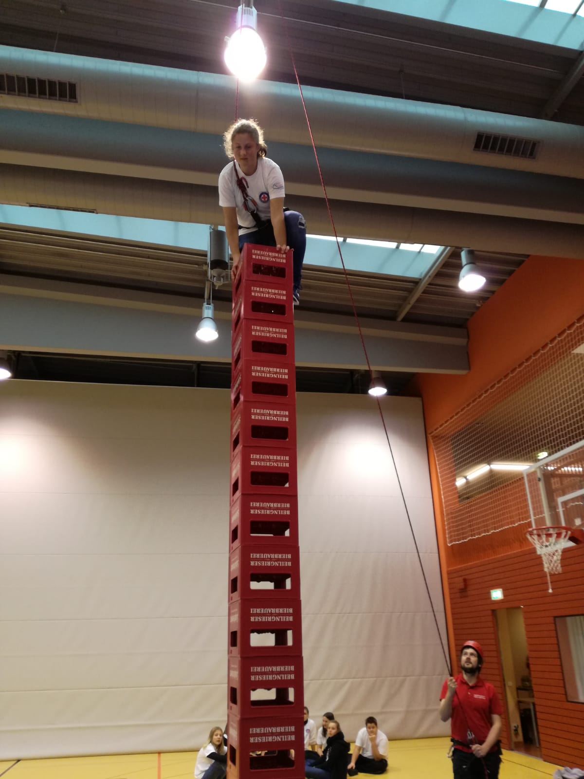 Am Samstag Nachmittag durften die Teilnehmer ihre Geschicklichkeit und Teamfähigkeit in verschiedenen Disziplinen unter Beweis stellen. Dazu waren in der Turnhalle und auch im Pausenhof 14 verschiedene Stationen vorbereitet. Dass bei der Wasserwacht Teamarbeit im Vordergrund steht, zeigte sich z.B. bei einer Getränkekistenralley, einem Geschicklichkeits- und einem Spineboardparcours sowie bei der pantomimischen Darstellung der Baderegeln. Beim Rollstuhlparcours und bei den Disziplinen Eierlauf, Wurfsackwerfen sowie bei der Knotenkunde waren individuelle Fähigkeiten gefragt, gewertet wurde aber immer die Leistung der gesamten Mannschaft. Mir fachmännischer Unterstützung und Absicherung durch die Kameraden von der Bergwacht war mit der Disziplin Getränkekistenstapeln zusätzlich einen neue Herausforderung ins Wettkampfprogramm aufgenommen worden. Mit bis zu 19 Getränkekisten wurde tatkräftig „hochgestapelt“.