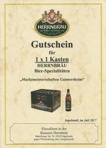 Als Anerkennung für die starke Beteiligung wurde uns vom Veranstalter im Rahmen der Proklamation des Schützenkönigs am Volksfest-Montag ein Gutschein für 1 Kasten HERRNBRÄU Bier-Spezialitäten überreicht – dafür bedanken wir uns recht herzlich!