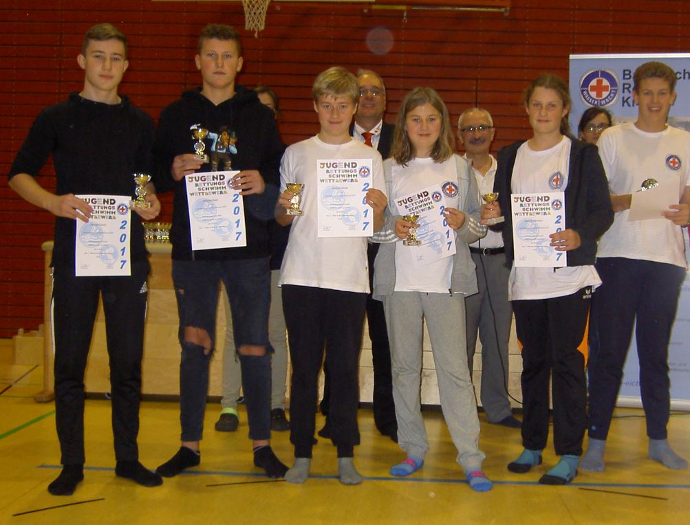 Zur abschließenden Siegerehrung kamen dann alle Teilnehmer und Betreuer noch einmal in der Sporthalle des Gymnasiums zusammen. Die Ehrung nahmen der Kreisgeschäftsführer des Bayerischen Roten Kreuzes Michael Gorum und der Vorsitzende der Kreiswasserwacht Peter Gampl vor. Assistiert wurde den beiden von der KWW-Jugendleiterin Stefanie Kaindl und deren Stellvertreterinnen Julia Ostermaier und Doris Keim. Ihnen sei an dieser Stelle noch einmal ausdrücklich für eine beispielhafte Organisation und Durchführung gedankt, dabei hat auch die erstklassige Verpflegung durch den Betreuungszug in der Rettungswache Beilngries besonderes Lob verdient.