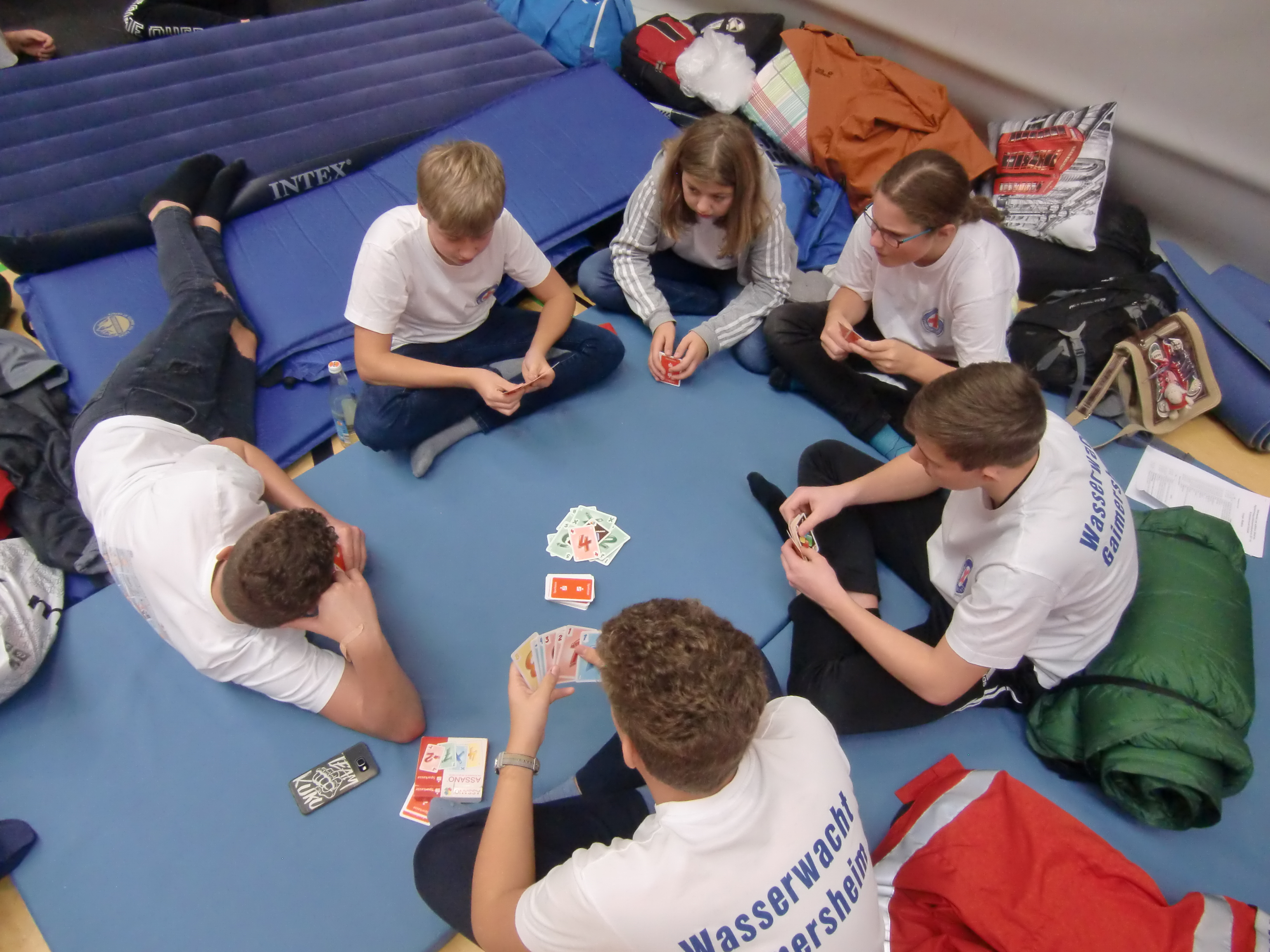 Am ersten Tag durften die Teilnehmer ihre Geschicklichkeit und Teamfähigkeit in verschiedenen Disziplinen unter Beweis stellen. Dazu waren verschiedene Stationen in der Turnhalle und auch im Pausenhof vorbereitet. Dass bei der Wasserwacht Teamarbeit im Vordergrund steht, zeigte sich z.B. bei einer Getränkekistenralley, einem Geräteparcours und der pantomimischen Darstellung von Baderegeln. Bei einem Rollstuhlparcours, im Tauchring- und Wurfsackwerfen sowie bei der Knotenkunde waren individuelle Fähigkeiten gefragt, gewertet wurde aber immer die Leistung der gesamten Mannschaft. Im theoretischen Teil war Wasserwachtswissen zum Thema Natur- und Gewässerschutz sowie über Notfälle im und am Wasser Bestandteil einer kurzen schriftlichen Prüfung.